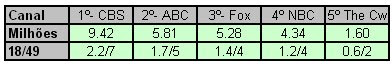 · A sexta dos canais americanas é muito parada, tem um share muito baixo por isso as séries não conseguem ter grandes números de audiência. Mas é mais uma noite em que a CBS é imbatível, e nesta sexta foi cheia de especiais. Teve um especial na ABC da Barbara Walters e um outro especial na CBS que o nome todo é "The Price is Right Salutes the Troops" que entrou no lugar da reprise de NCIS que já tinha entrado no lugar da série "The Ex-List" mais por falta de audiência acabou sendo cancelada. Na verdade o especial da CBS não conseguiu manter os bons números que a reprise de NCIS vinha conseguindo.